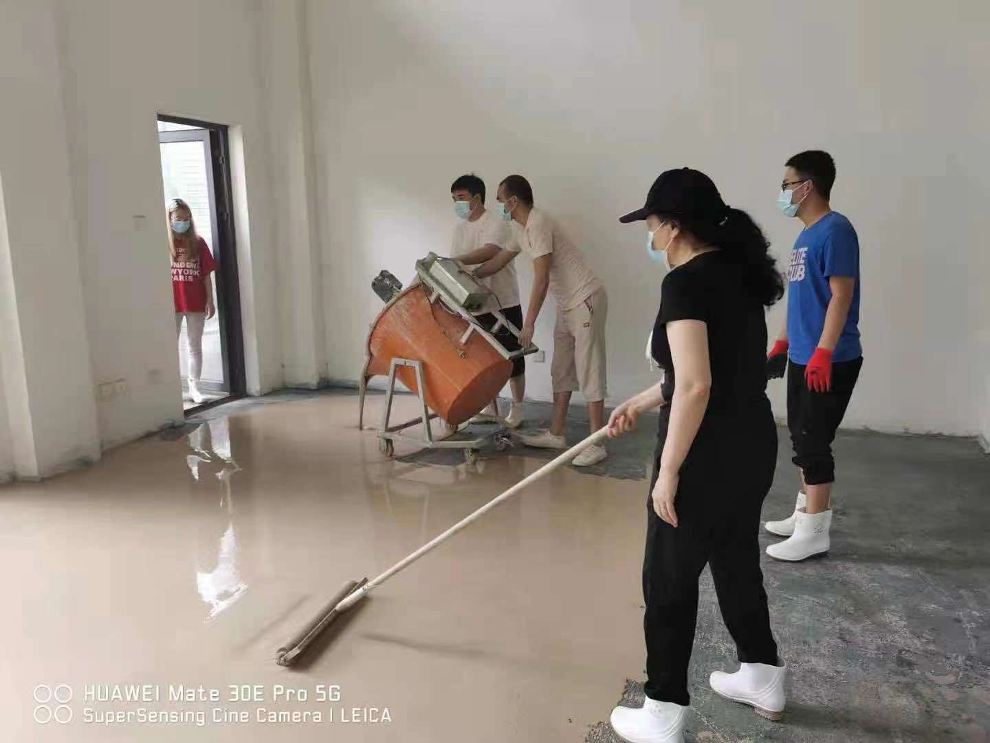 活動(dòng)開(kāi)始,建材事業(yè)部部長(zhǎng)李茂春組織將到場(chǎng)員工分成兩班組施工,各司其職,各班組有序施工。將一定比例的石膏基自流平與水混入攪拌桶內(nèi),持續(xù)攪拌約3分鐘,一次性倒在地面上,自流平的流動(dòng)性好,產(chǎn)品可以根據(jù)地面的高低不平順勢(shì)流動(dòng),對(duì)地面進(jìn)行自動(dòng)找平,無(wú)需外力推動(dòng)。2個(gè)班組耗時(shí)不到8小時(shí),完成450㎡施工作業(yè),等待24小時(shí)后,地面即干燥可使用。我司自產(chǎn)“藍(lán)花楹”自流平產(chǎn)品具有品質(zhì)好,施工便捷高效的特點(diǎn)。
