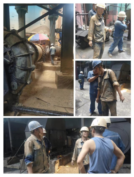 8月10日12:00左右,攀藍鼎2燒1#循環(huán)泵進口軟連接破裂,備用泵2#循環(huán)泵進口閥無法開啟投入使用,對生產運行造成嚴重風險,如不能馬上消除故障,啟動備用2#泵,會導致出口SO2指標不受控,致使前端減產或停產。故障就是指令,出現(xiàn)故障后生產部立即組織檢修班長何亮、副班長蘇仕國、生產班長鄭義現(xiàn)場制定搶修保產方案。